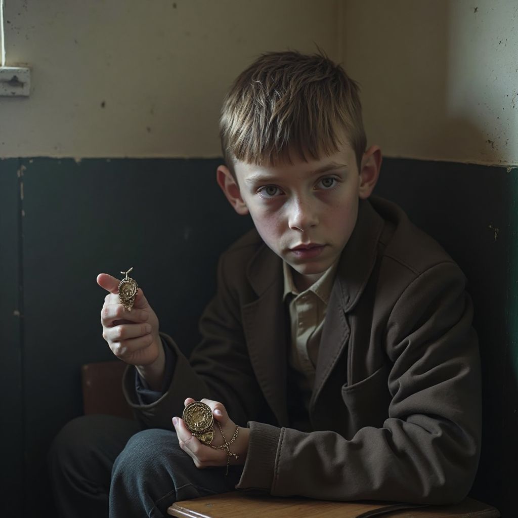 В углу класса сидел маленький мальчик, сгорбившись, и боязливо прижатый к стене. Его неопрятный свитер был старым и потертым, а на глазах — печать одиночества и страха. Глаза, большие и настороженные, быстро мелькали по комнате, излучая беспокойство. Его короткие волосы были растрёпаны, а руки тряслись, как будто боялись прикоснуться к чему-то важному.