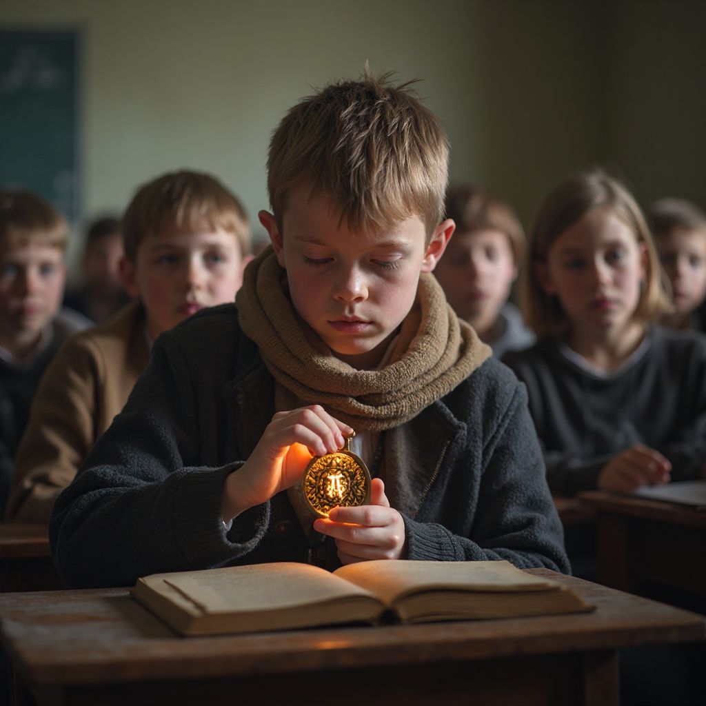 Мальчик в углу класса собрал всю волю в кулак и медленно поднял руку, держа в ней амулет. Взгляды всех учеников и учительницы устремились к нему с нескрываемым интересом и робким страхом. Сердце мальчика колотилось, как барабаны на марше, пальцы слегка дрожали. Он чувствовал, как напряжение в воздухе становится невыносимым, словно всё вокруг замерло в преддверии потрясения.