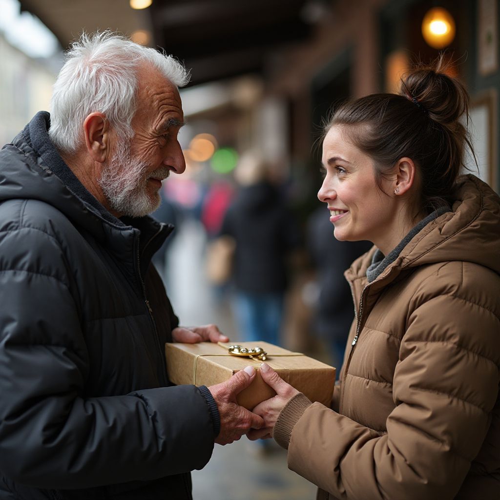 Девушка улыбнулась, теперь уже не одинокая, сгорбленная фигура старика наполнилась светом благодарности и новой жизни. «Жизнь — как свёрток: иногда внутри скрываются неожиданные подарки,» — прошептала она, глядя в будущее.