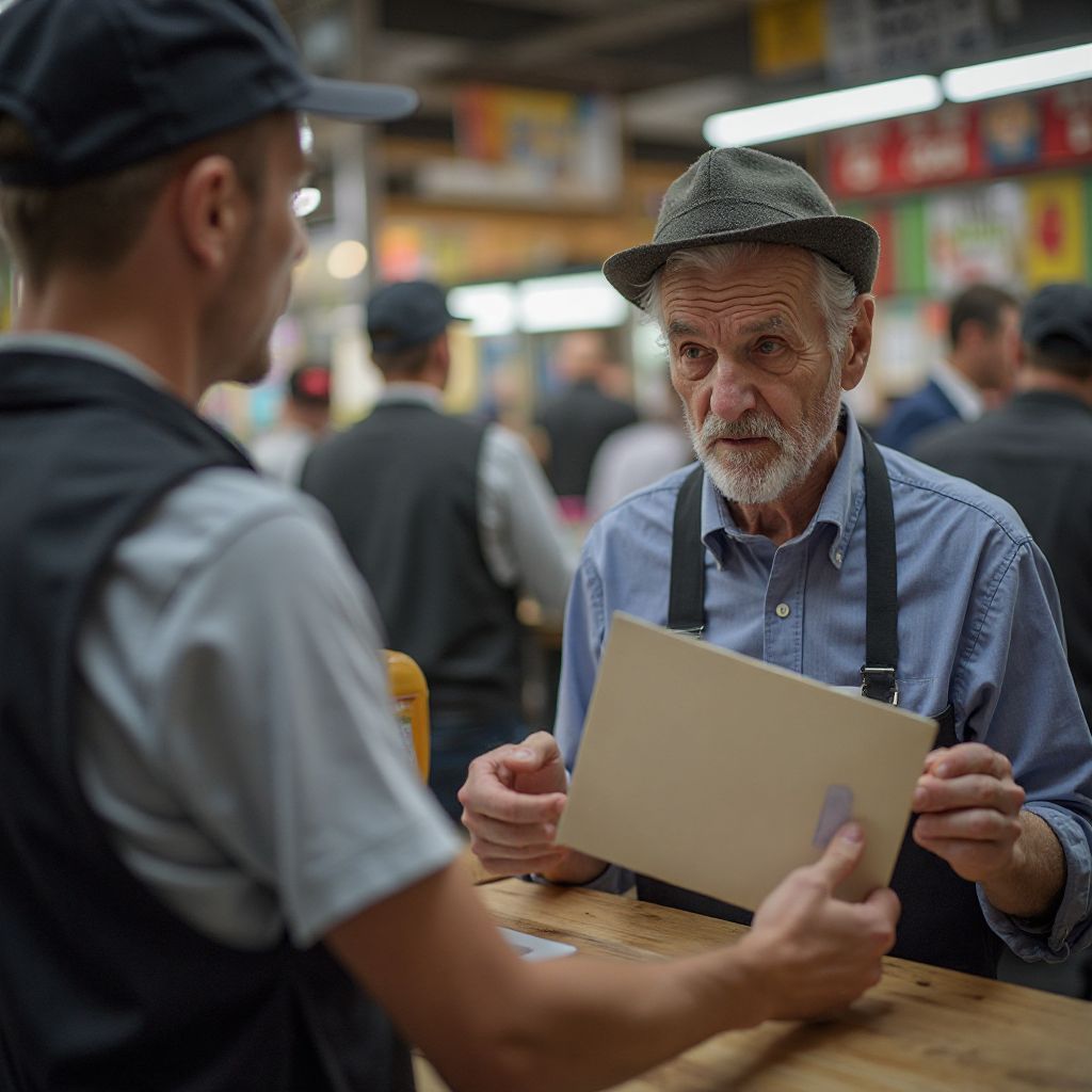 Старик медленно повернул спину, чувствуя, как все взгляды устремлены на конверт, лежащий на кассе. Сердце его билось учащённо — мурашки пробежали по коже, словно ледяной дождь, заставляя судорожно сжимать трость. В воздухе повисла напряжённая тишина: продавец, покупатели, все затаили дыхание. Один из клиентов, не выдержав, протянул руку, собираясь открыть конверт, но продавец строго остановил его: — «Подождите, старик просил не открывать раньше…» Люди стали переглядываться, лица их выражали смесь нетерпения и тревоги.