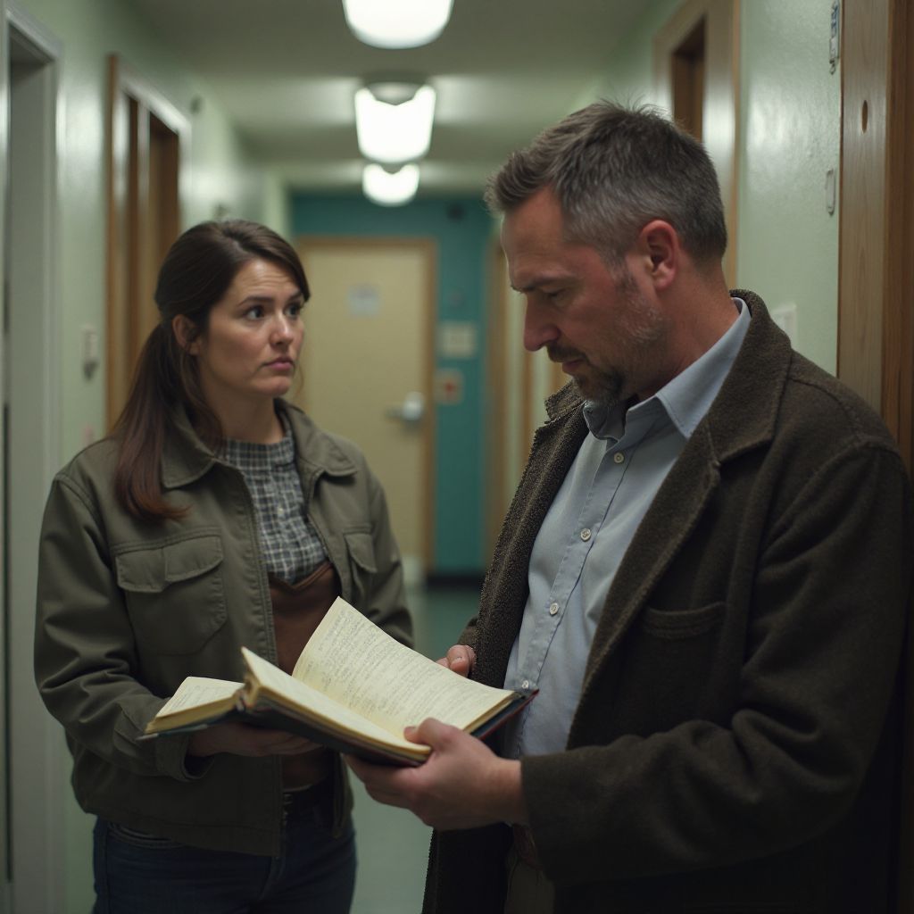 Анна стояла на пороге кабинета директора, дрожащие пальцы сжимали дневник — тот самый, что она тайно читала. В коридоре было холодно, и сквозняк от распахнутой двери холодил кожу. На лице у неё возникло решительное выражение, несмотря на страх, что сжимал горло. Она открыла дверь и увидела строгую фигуру директора — женщину средних лет, с усталыми глазами и деловым костюмом, что врезался в обстановку как знак власти.
