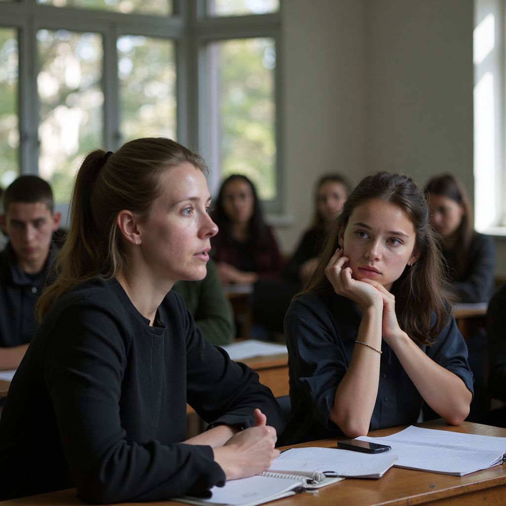 Все замерли, в воздухе повисла тишина, прерываемая лишь учащённым дыханием. Ученики стали сжимать руки в кулаки, образы в их головах сталкивались между страхом и ожиданием. Марина Сергеевна поднялась и прошла по классу, её осанка была непреклонна, но в глазах светилась неопределённость.
