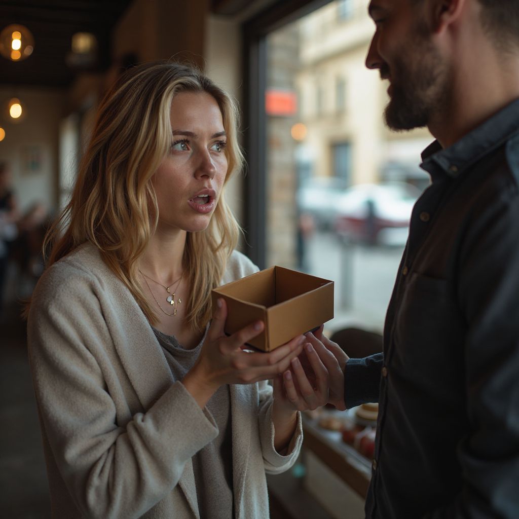 Внезапно к её столику подошёл незнакомый мужчина. Он был среднего роста, в поношенной куртке, с пронзительным взглядом. Не сказав ни слова, он тяжело поставил перед ней маленькую коробочку — аккуратно завязанную простой лентой. Женщина замерла, не в силах произнести ни слова, взгляд её метался между коробочкой и незнакомцем. Вокруг послышался шепот: «Кто он?», «Что это?» — глаза посетителей кафе искали ответ в её лице.