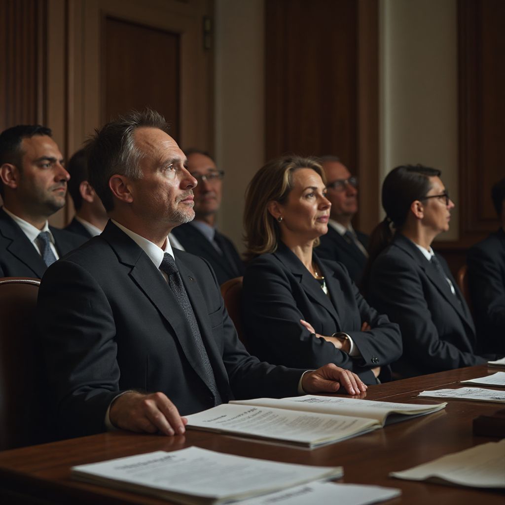 В сгущающихся сумерках старого суда раздавался тихий гул голосов и скрип деревянных половиц. Воздух был пропитан запахами пыли, старинного дерева и едва уловимыми нотками мокрого асфальта с улицы. Через высокие окна на зал суда падали холодные бледно-жёлтые лучи уличных фонарей, отбрасывая длинные тени на каменные стены. В зале царила тишина, нарушаемая лишь редкими шорохами и приглушёнными вздохами, словно время остановилось в ожидании чего-то судьбоносного.