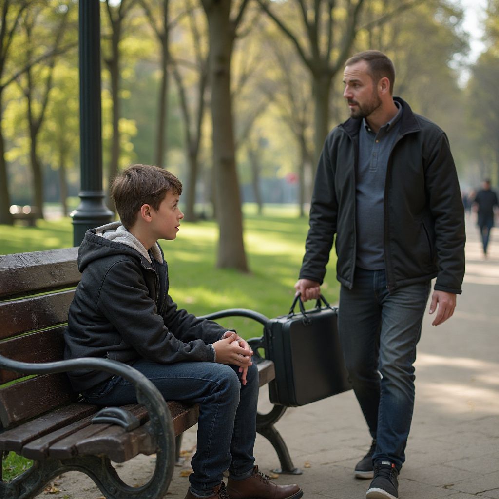 К соседней скамейке подошли двое мужчин в грубой одежде, голос их рубился на повседневные споры: «Слушай, может, этот портфель — чей-то, надо бы вернуть, а то потом проблемы будут.» — сказал один. «Да пофиг, кто там штаны протирал — найдешь и возьмёшь себе, кому он нужен,» — мрачно ответил второй, кивая в сторону мальчика. Парень сжал в руках потёртый ремешок, внутренне вздрагивая. Здесь социальное неравенство чувствовалось на каждом шагу, а невозможность помочь казалась невыносимой.
