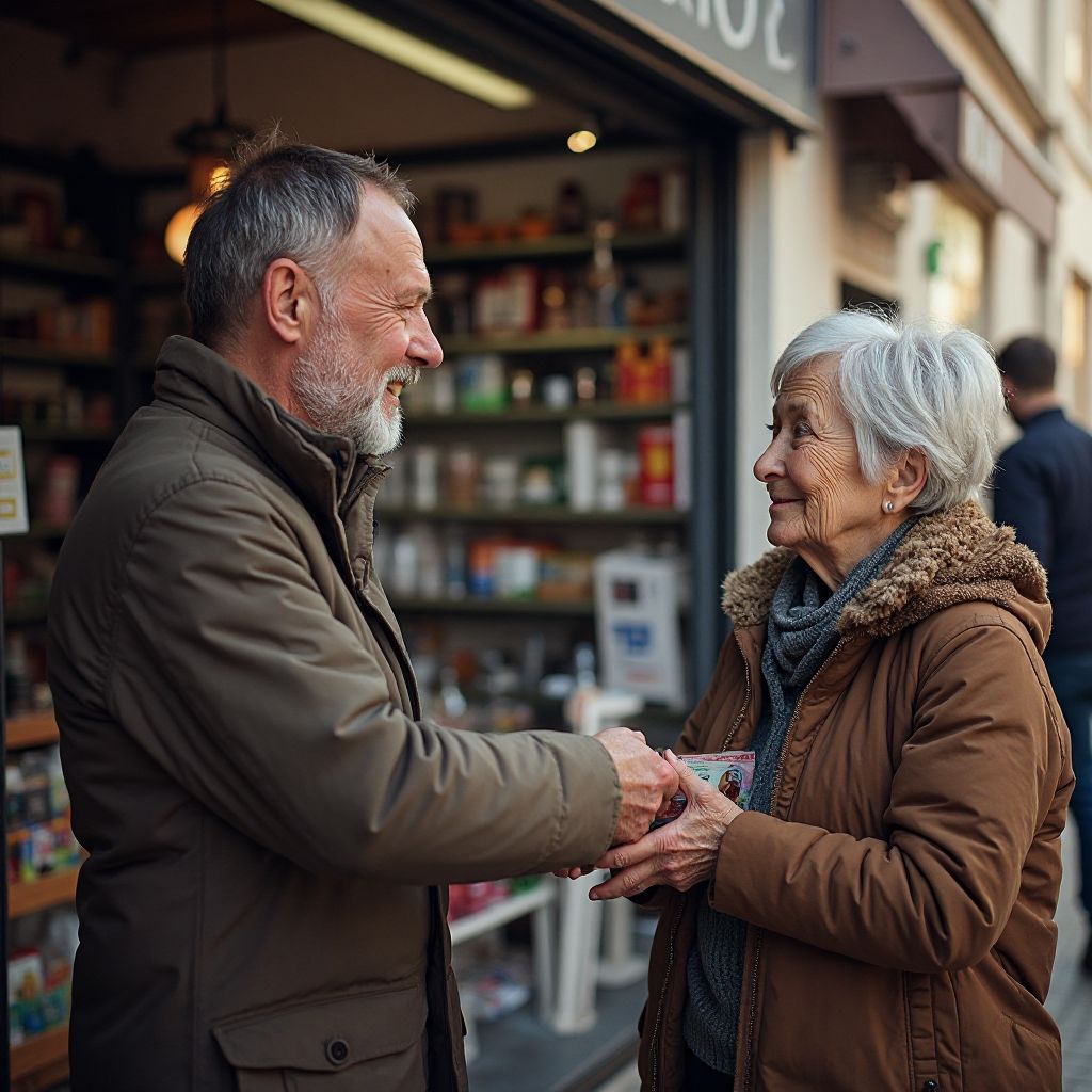Подойдя к кассе, мужчина заметил старушку, которая стояла на другом конце очереди, держа в руках крошечный пакет, приспособленный в бумажный кулёк. Магазин, заполненный шумом, казался немым свидетелем разницы в их судьбах. «Позвольте, я оплачу ваши покупки», — вдруг тихо произнёс он, чувствуя, как внутри что-то сжалось. Она лишь кивнула в ответ, глаза её были усталые и внимательные.