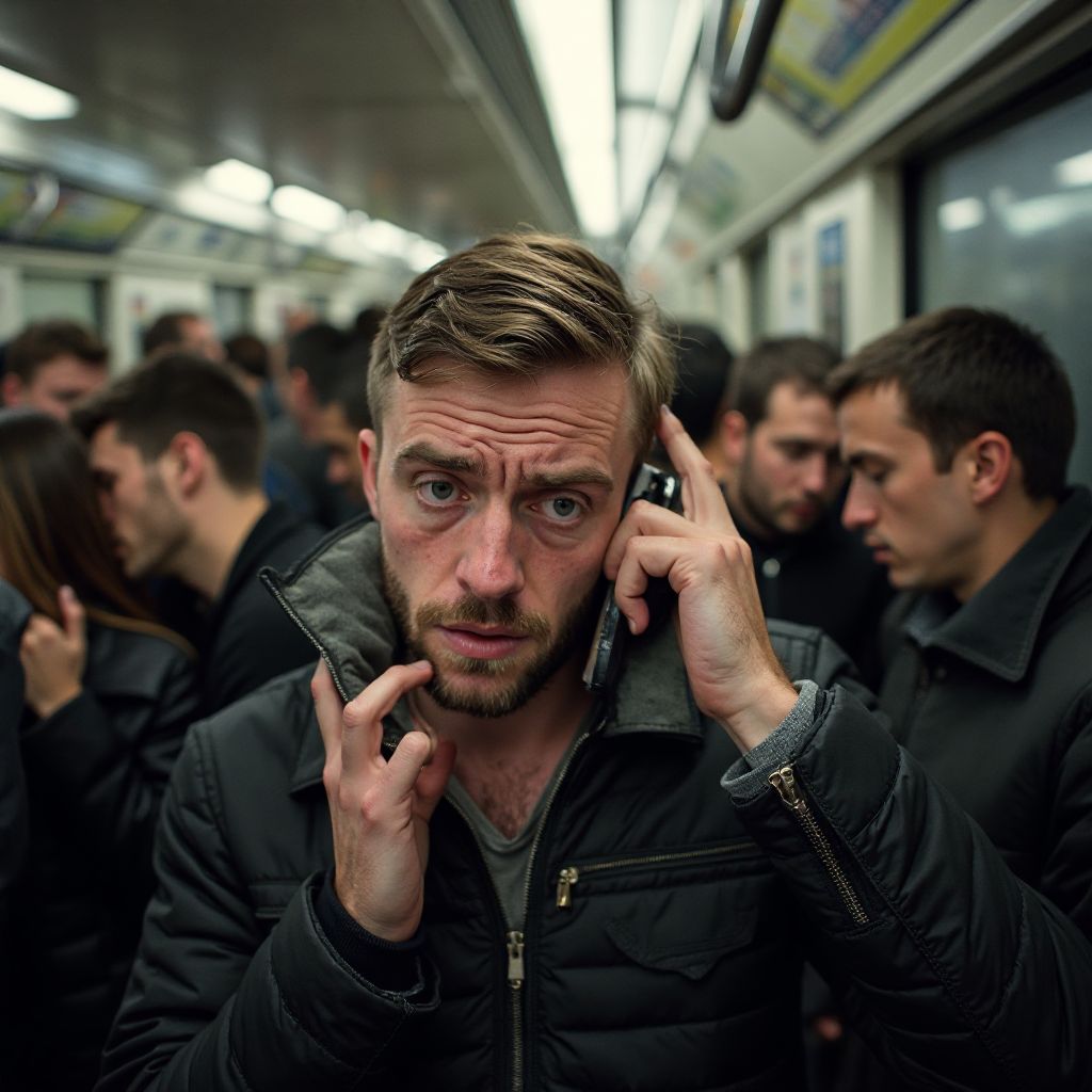 В углу вагона, сидя на разодранном пластиковом сиденье, стоял Андрей — мужчина средних лет с усталым, но сильным взглядом глубоких зелёных глаз. Его высокий рост и слегка сутулую осанку выдавали годы тяжёлой работы на складе, а потрёпанная куртка и выцветший шарф, туго обмотанный вокруг шеи, не скрывали скромного социального статуса. Его руки, огрубевшие и покрытые мелкими царапинами, покоились спокойно на коленях. В сумке на полу — пара старых книжек и исписанный блокнот, в который он всё время заглядывал, как будто там хранилась надежда.