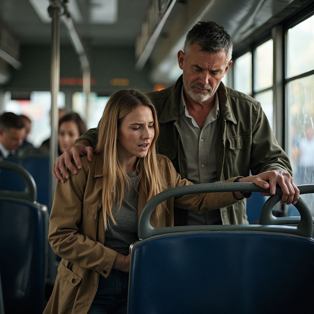 Он поднял руку, подавая знак, и женщина рядом поспешила к водителю. «Водитель, остановитесь, вызовите скорую!» — потребовал он решительно, одновременно аккуратно поддерживая девушку. «У неё ребенок… беременная?» — один из молодых пассажиров пробормотал недовольно, но уже тише, словно осознав своё поведение. «Да, она беременная, — сказал случайная женщина с рынка, заметившая сумку рядом, — ей нужна помощь». Мужчина повернулся к сердитым голосам с мягкой твердостью: «Никто не вправе судить её судьбу. Мы все можем оказаться на её месте».
