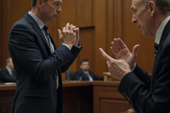 Пыльный зал суда окутан тусклым светом старых люстр, их мерцание отражается от выцветших стен.