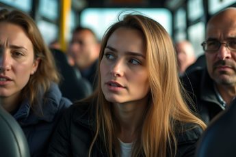 Шумящий автобус медленно продвигался по залитой дождём улице, отражая тусклый свет фонарей на мокром асфальте.
